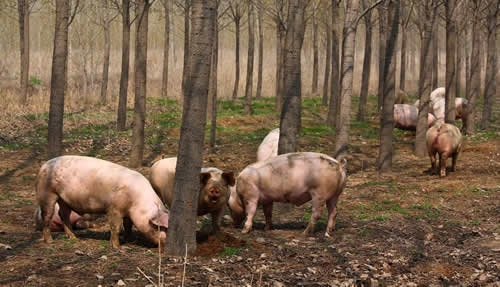 禹田生態(tài)放牧豬每天都是自己跑到山上去采食,在山上吃些雜草、作物秸稈和一些野果等。這些放牧豬每天在山上的活動(dòng)時(shí)間是八個(gè)小時(shí)以上,吃完了撒個(gè)歡兒、賽個(gè)跑、洗個(gè)泥巴浴,日子過得無拘無束、悠然自得。散放飼養(yǎng)的豬要在山上長一年之后才會(huì)屠殺,完全是原生態(tài)自然生長,從未喂過含任何快速生長激素的合成飼料。
